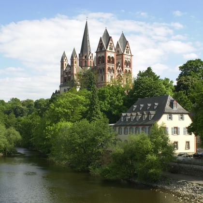Zwischen Taunus und Westerwald windet sich heute der Flusslauf. Sie radeln auf dem asphaltierten Leinpfad idyllisch über Aumenau und Runkel bis Limburg. Der Limburger Dom, auch Georgsdom genannt, thront oberhalb der Altstadt neben der Burg Limburg. Diese hohe Lage auf den Felsen oberhalb der Lahn sorgt dafür, dass der Dom weithin sichtbar ist. Er gilt als eine der schönsten Schöpfungen spätromanischer Baukunst. Nicht nur der Besuch des weltberühmten Limburger Doms ist ein absolutes Muss, sondern auch der Bummel durch die Innenstadt, denn sie zählt zu den schönsten Altstädten Deutschlands!