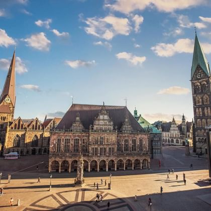 Vorbei an der Storchenpflegestation radeln Sie auf Bremen zu. Vielleicht werden Sie schon von weitem von den Bremer Stadtmusikanten begrüßt, doch auf jeden Fall sollten Sie sich die Bronzeplastik am Rathaus ansehen.