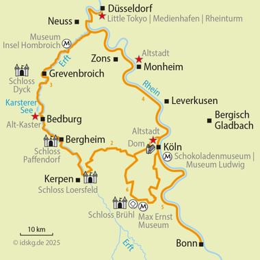 Today's cycle route always follows the Erft. You cycle first to Pfaffendorf Castle with its brasserie and beer garden and then past the decommissioned Frimmersdorf power station into the Grevenbroich recreational area. Your journey continues to Dyck Castle. With the Museum Insel Hombroich and the Clemens Sels Museum, culture is the order of the day on this stage. The extremely scenic route along the Erft offers a 7 km branch via Langwaden Abbey and Hülchrath Castle. You soon reach Neuss, where the Erft flows into the Rhine. You first follow the Rhine Cycle Path on the left bank of the Rhine before crossing the Rhine to Düsseldorf's Rhine embankment promenade and old town. In the evening, enjoy a Düsseldorf Altbier and the fantastic view of the Rhine.